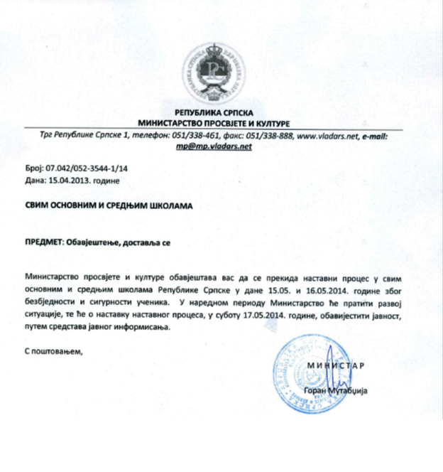 Обавјештавамо вас да је због безбиједности и сигурности ученика прекида наставни процес у свим основним школама у Републици Српској како је и наведено у обавјештењу.