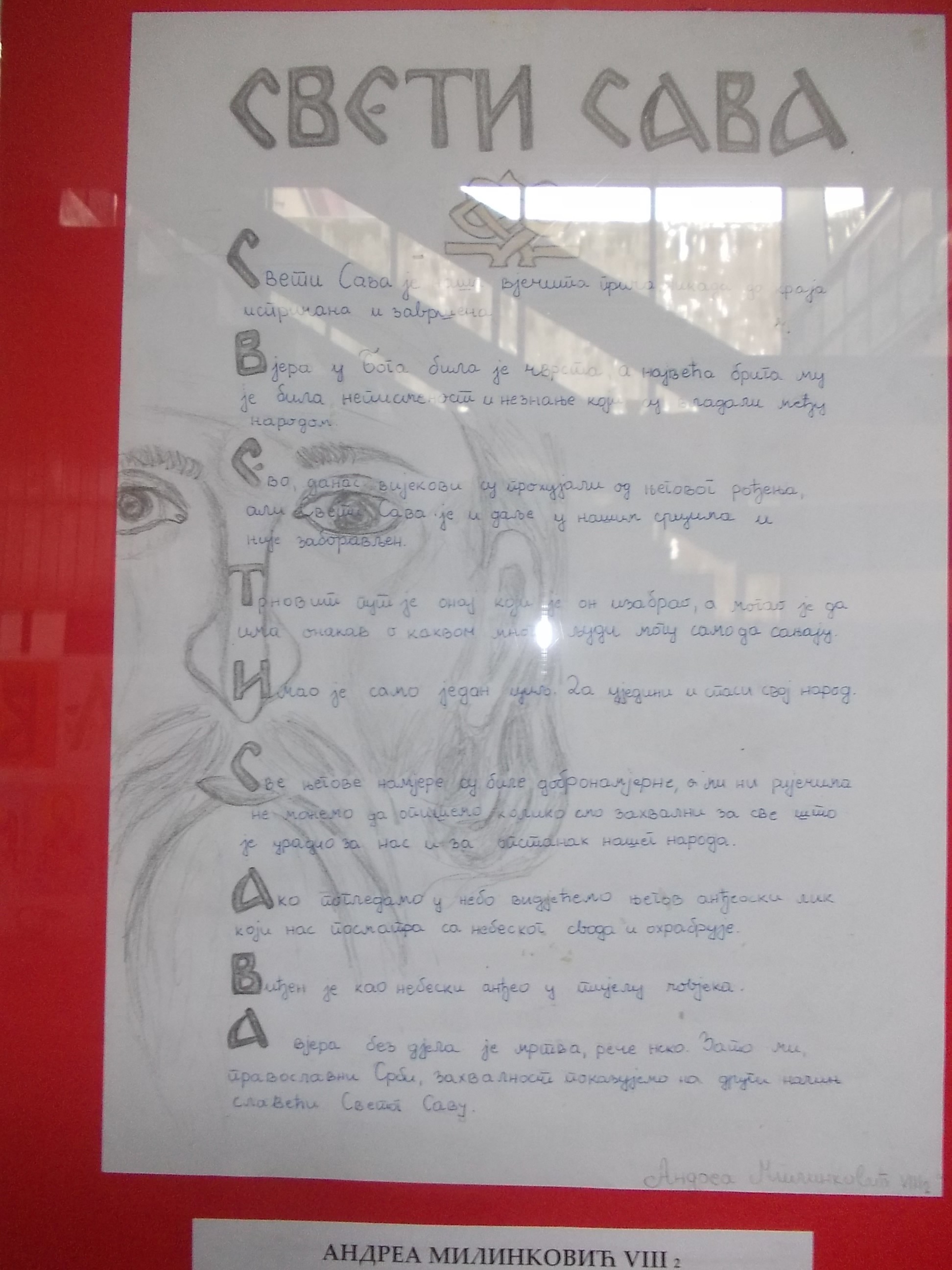 Лик Светога Саве најуспјешније је осликао Стефан Грбавац, ученик VI1 разреда. Честитамо! На крају, најбоље и најљепше, краснописом, о Светоме Сави писала је Андреа Милинковић, ученица VIII2 разреда. Честитамо!