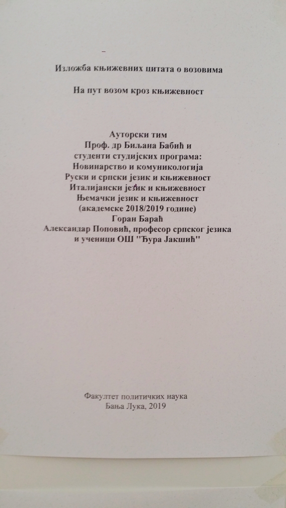 Свечано отварање изложбе „На пут возом кроз књижевност“ одржано је у петак, 08. новембра 2019. године, са почетком у 10.30 часова, у Свечаној сали Факултета политичких наука, а иста изложба биће отворена и у четвртак, 14. новембра 2019. године, са почетком у 11.00 часова, у холу Жељезничке станице у Бањој Луци.