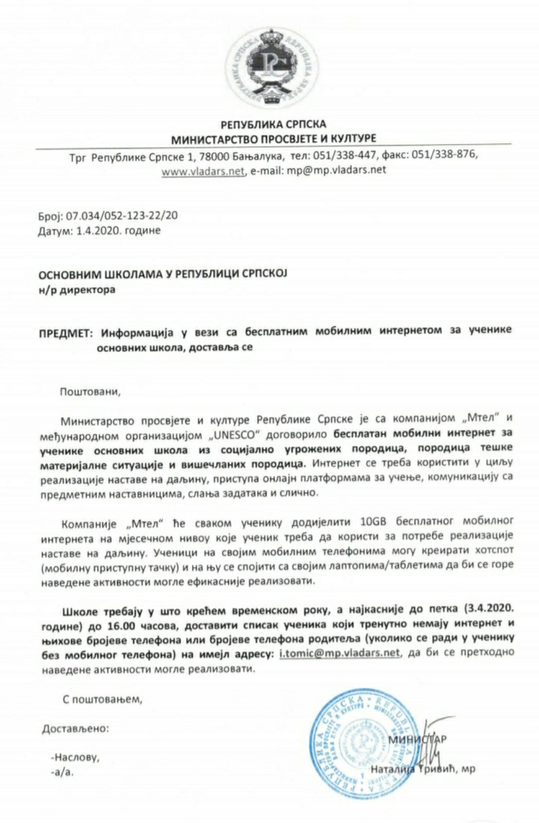 ПРЕДМЕТ: Информција у вези са бесплатним мобилним интернетом за ученике основних школа