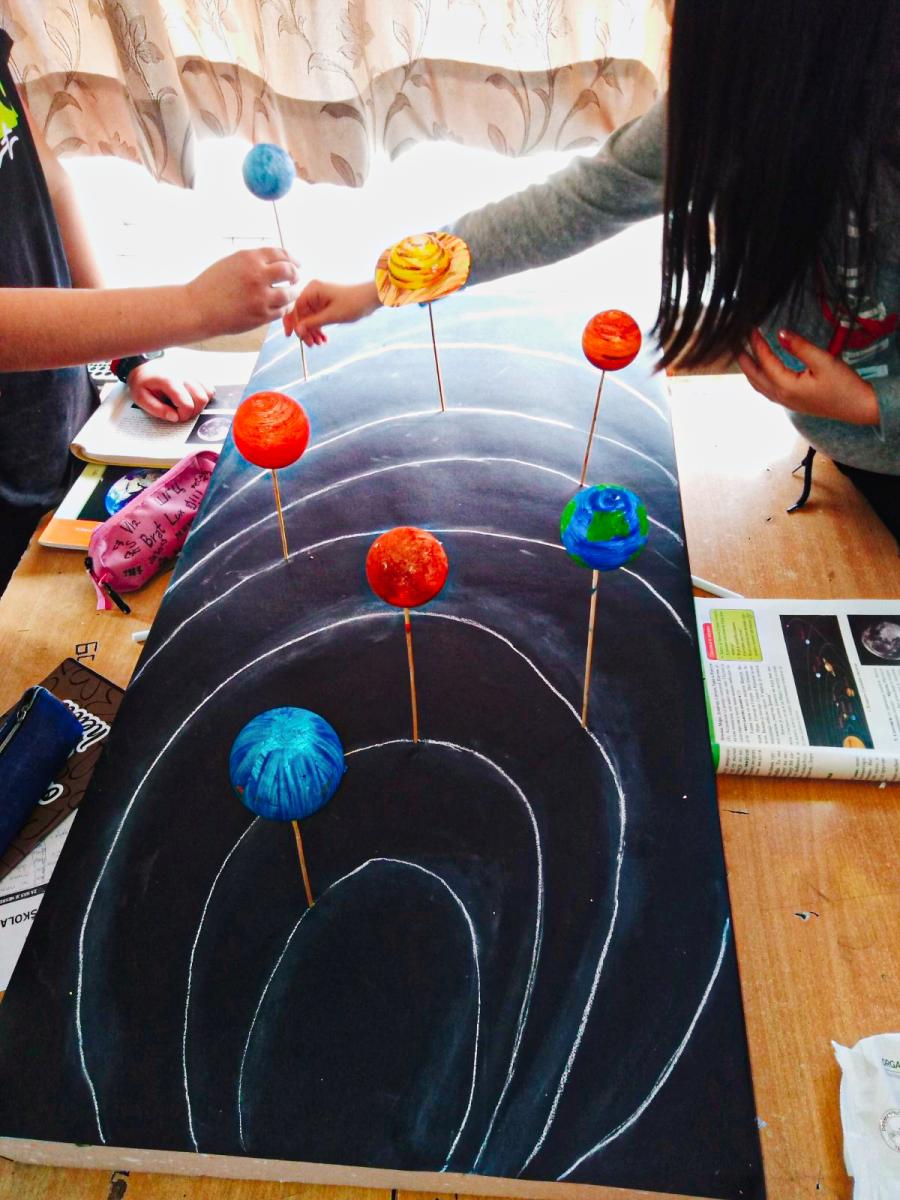 Ученици одјељења VI 2, заједно са наставницом географије Бранком Малићевић, израдили су макету Сунчевог система и изложили је у холу Школе.
