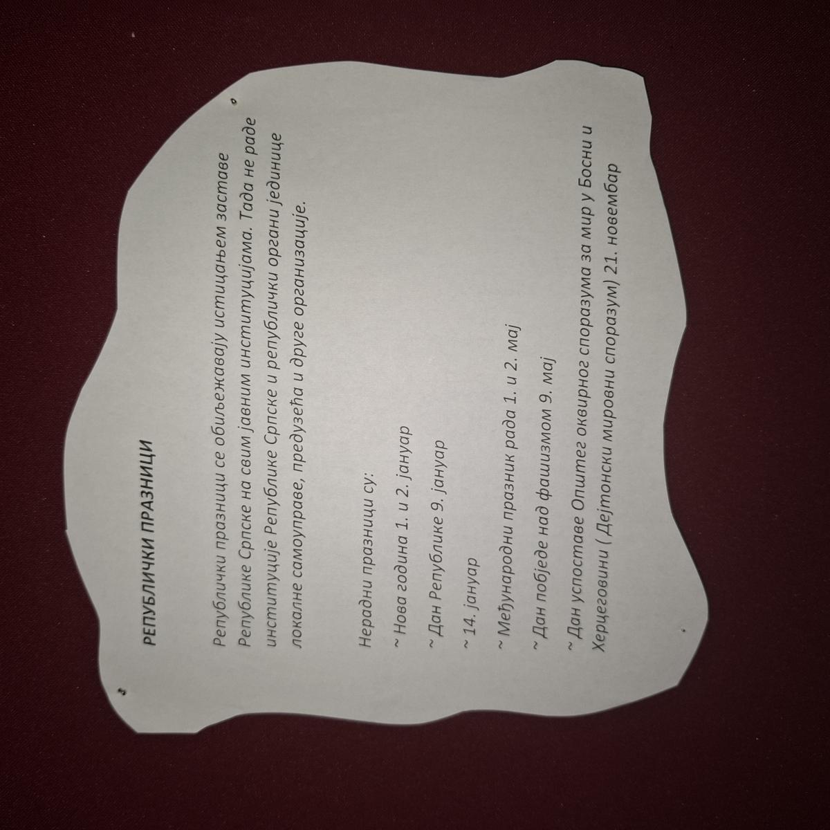 Дан Републике Српске се празнује 9. јануара као један од републичких празника у Републици Српској. Ове године наша Република слави 33. рођендан. Чланови Новинарске секције били су вриједни на часовима секције и дали су свој допринос у обиљежавању овог значајног датума. Они су украсили хол наше школе и писали о битним карактеристикама наше домовине. Република Српска је трајна категорија, већа од било кога. И како каже наш велики писац Бранислав Нушић, отаџбина није ограничен, оивичен и утјеловљен предмет. Отаџбина је мисао, отаџбина је вјера, а мисао и вјера никад не умиру. Република за нас који живимо у њој, представља нашу домовину која има душу, јединствену природу и људе који је красе и увијек је на првом мјесту у нашем срцу.