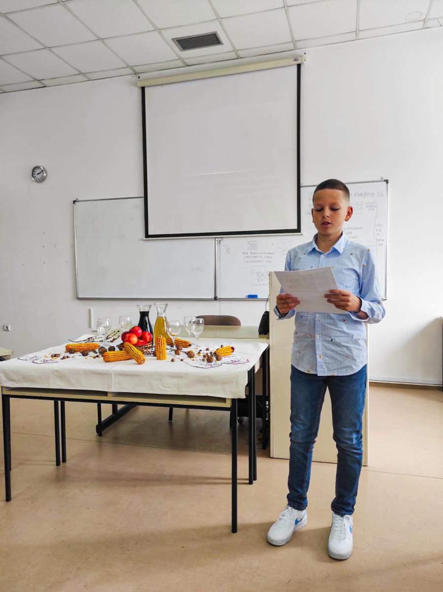 Јаков Дуњић, ученик петог разреда наше школе, говорио је о животу, раду и значају Вука Стефановића Караџића за српски језик и писмо.