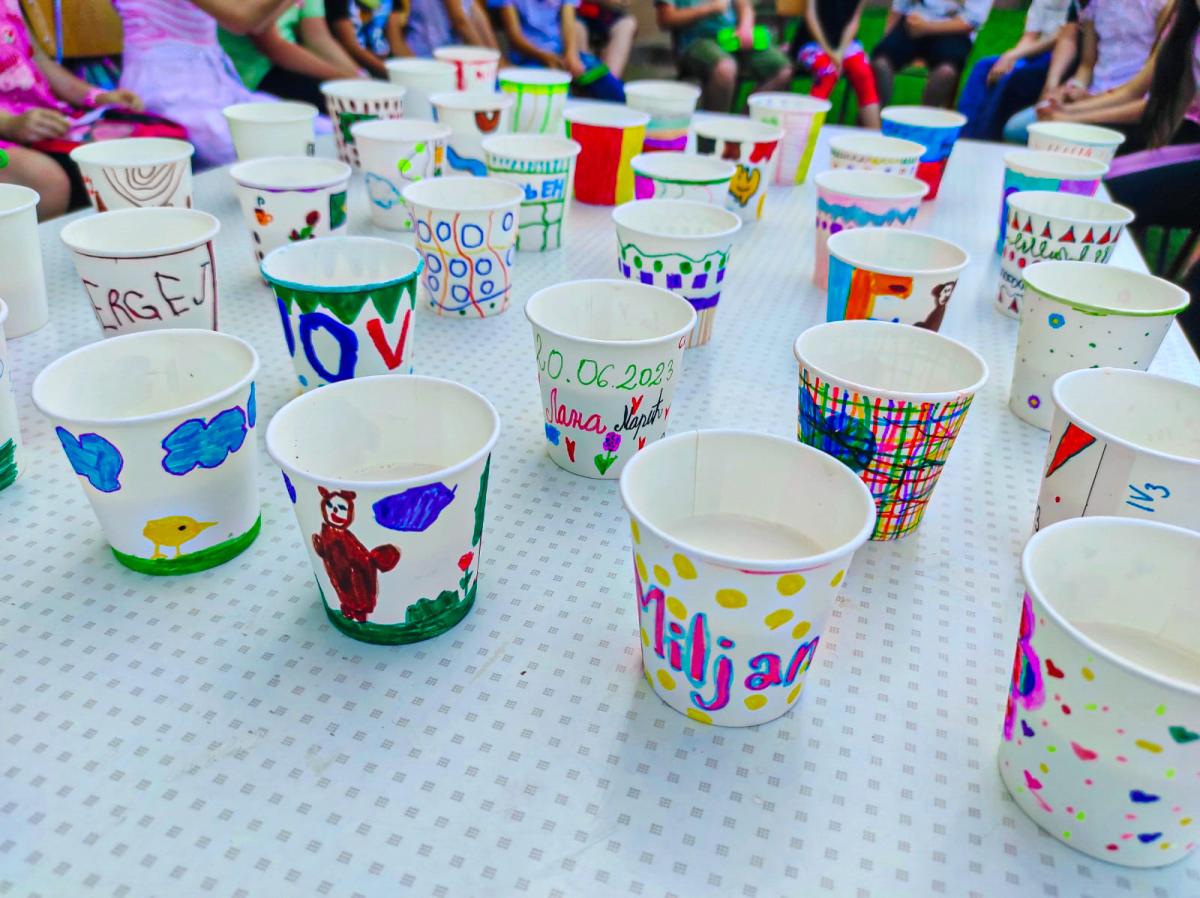 Ученици су у току радионице чај конзумирали из својих омиљених шоља, које су донијели од кућа, док су бијелу кафу пили из бијелих, картонских чаша, које су самостално дизајнирали и маштовито осликали ликовима и мотивима по жељи.